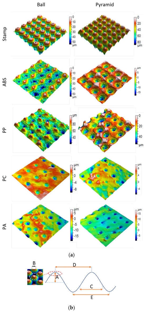 Figure 5a shows the confocal images of the laser textures on the stamps as well as the micro-geometries that are transferred to the polymer surfaces. Comparing these images indicates that, for both ABS and PP, the micro-features are transferred almost one by one, while for PC and PA, the transformation is not complete. To compare and quantify these textures together, it is necessary to characterize the geometrical features of the structures. Figure 5b represents these features, and they are summarized in Table 4. The micro-features measured are height (A), landing length (B), width (C), peak-to-peak distance (D), and valley-to-valley distance (E). Overall, for the stamps, the pyramid texture exhibits the largest values in height, width, and valley-to-valley distance, while the ball texture tends to have lower measurements across the tip and peak-to-peak distance.