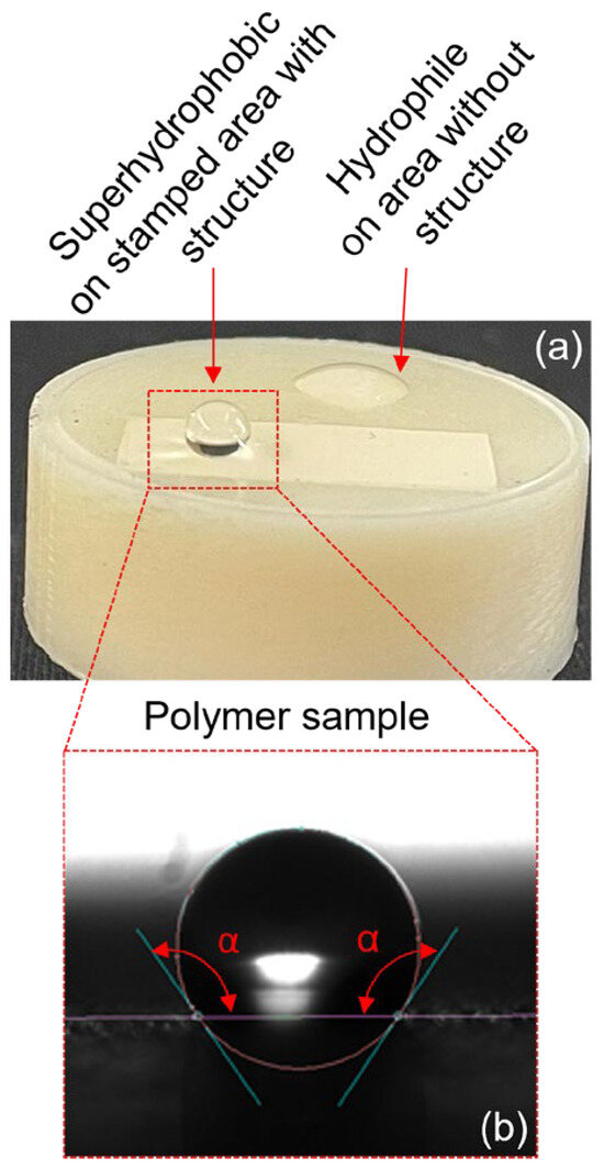 J. Sun et al. [20] explored the use of stainless steel stamps to create polymeric superhydrophobic surfaces with biomimetic hierarchical roughness through isothermal hot embossing. The resulting surfaces featured micro-platforms and microfibers formed during molding. This resulted in a water contact angle of 154° and an oil contact angle of 97°, which increased to 140° after fluorosilane modification. Water droplets rolled off the surface at a tilt of approximately 1°, indicating a very low sliding angle.