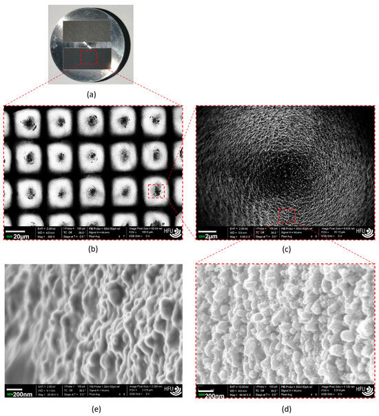 Investigation into nano-structures on the stamp—(a) laser-textured stamp, (b) pyramid texture array, (c) micro-feature, (d) ridge nano-structure before hot-embossing, and (e) ridge nano-structure after hot-embossing.