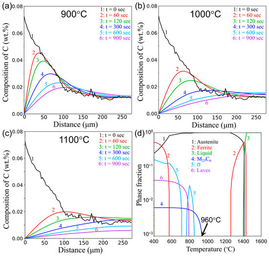 Diffusion simulation based on the diffusion module (DICTRA: Diffusion-Controlled Transformations) of the Thermo-Calc software (version 2021b) was used to guide the optimization of the parameters for decarburization heat treatment. The schematic of the simulation model setup is shown in Figure 2. The calculations were performed in the temperature range of 900 to 1100 °C in steps of 100 °C. As the matrix phase in the SS316L steel, the austenite (FCC) phase was considered for all temperatures. The thermodynamic and mobility databases used for these calculations were TCFE9 and MOBFE4, respectively. The simulations were performed for 5 h (18,000 s) with 100 grid points in accordance with the EPMA measurement. Additional inputs, such as the width of the cell, the position of grid points within the cell, and the carbon composition at each grid point, were chosen based on the results from the EPMA measurement. The composition of other alloying elements (Cr, Ni, Mo, Mn, and Si) in SS316L steel was measured using EDS in the same region where the EPMA measurements were performed and used as input for the kinetic simulations. To mimic the decarburizing atmosphere, the activity of carbon in the outer atmosphere interacting with the interface of the simulation cell was set to 10−6.