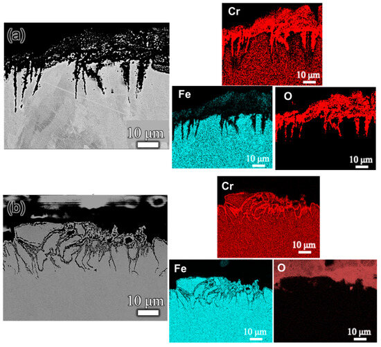 Having established the optimal decarburization temperature as 1000 °C through prior computational analysis, it is now essential to refine our understanding of the ideal decarburization time through systematic experimental investigations. Moreover, determining the suitable atmosphere for the decarburization process is crucial. Consequently, decarburization was carried out at 1000 °C under two distinct atmospheres: flowing air and vacuum, each for varying durations (30, 60, and 120 min). Flowing air was selected due to its well-documented efficacy in reducing carbon content in steels. This is achieved through the formation and subsequent release of CO gas generated by the reaction between the excess surface carbon and atmospheric oxygen. The composition maps, obtained through EDS analysis, for the SS316L sample subjected to decarburization at 1000 °C for 30 min in flowing air, as shown in Figure 7a, clearly indicate the presence of a substantial layer of Cr-rich oxide, whereas in the vacuum atmosphere, no significant oxidation was observed (Figure 7b). Given that the sample subjected to the shortest decarburization duration already exhibited oxidation, it is reasonable to assume that samples exposed to longer decarburization times (60 and 120 min) would also experience comparable or even worse surface oxidation. This observation highlights the inadequacy of decarburizing SS316L steel in a flowing air environment, primarily attributed to the formation of a substantial Cr-rich oxide layer on the steel surface.