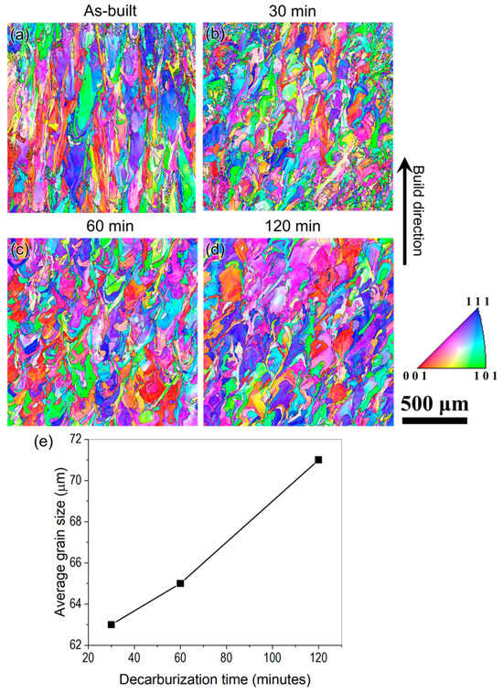Inverse pole figure (IPF) maps, generated using EBSD to reveal the grain structure of SS316L samples decarburized at 1000 °C in a vacuum for varying durations, are displayed in Figure 9. These maps show that post-decarburization grains are more rounded compared to the columnar grains typically formed during the LPBF process in SS316L steel, as seen in Figure 9a–d. The aspect ratios (length/width) of a minimum of 20 grains measured using the ImageJ software (version 15.3) for the as-built sample and the sample decarburized for 30 min were found to be 5.88 ± 1.07 and 1.80 ± 0.58, respectively, proving the roundness of the grains. This change is attributed to the sensitization treatment conducted at 915 °C. Average grain sizes for the various decarburization conditions were calculated from IPF maps across three distinct regions using the TSL-OIM software (version 7). The grain size plot indicates significant coarsening in the sample decarburized for 120 min, with an approximate 10% increase in grain size relative to the 60 min sample. Conversely, the sample decarburized for 60 min exhibits a modest increase in grain size (~2%) compared to the 30 min sample. Therefore, a decarburization duration of 120 min at 1000 °C in a vacuum is not optimal due to the pronounced grain coarsening.