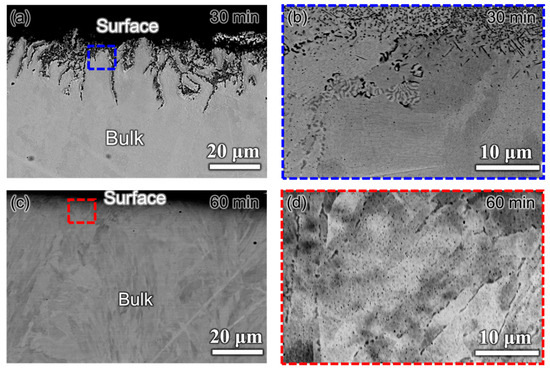 Subsequent microstructural analysis near the surface of SS316L steel decarburized for 30 and 60 min was performed to determine the optimal decarburization time between these two conditions, as illustrated in Figure 10. The SEM micrograph near the surface of the 30 min decarburized sample reveals black features akin to those in the as-etched sample (Figure 4), corresponding to M23C6 carbides, as shown in Figure 10a. Although the surface carbon content has decreased, a considerable number of M23C6 particles remain near the surface after decarburization at 1000 °C for 30 min in a vacuum. In contrast, the microstructure near the surface of the 60 min decarburized sample shows no such features, as depicted in Figure 10b. Additionally, a high-magnification image (Figure 10c) indicates the presence of a few small, discontinuous M23C6 particles at grain boundaries and within grains, which is unlikely to impact the properties significantly. Therefore, based on grain structure analysis after microstructural characterization near the surface, the optimal decarburization time at 1000 °C in a vacuum is established at 60 min.