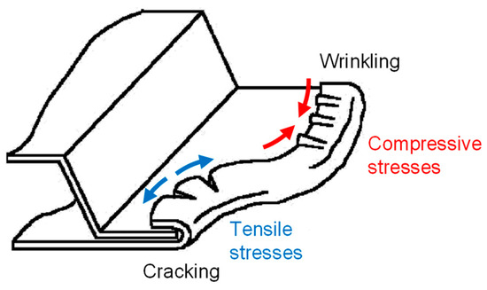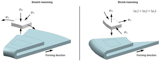 In addition to joining parts, hemming in general increases the stiffness of the part, eliminates acute edges, and improves appearance [3]. Conventional hemming, also known as table-top hemming, relies on rigid tools in a press, whereas roller hemming utilizes a universal roller, typically guided by a robot along the hemming line. This makes roller hemming much more flexible, as no dedicated tools are required. The advantages of this process include rapid adaptation to new product geometries and low investment costs. The disadvantages in comparison to table-top hemming are the longer process times and the low system stiffness. Within the robot’s working space, the effective levers are constantly changing and thus influence the forming force generated by the robot arm [4,5]. However, geometric defects such as wrinkles and cracks are often observed during pre-hemming for both hemming processes [6,7,8]. The reasons for this are non-uniform tangential compressive stresses and increased compressive stresses when hemming convex edges (cf. Figure 3) [9,10]. In roller hemming, the tendency for wrinkling is higher for smaller roller diameters and greater pre-hemming bending angles.