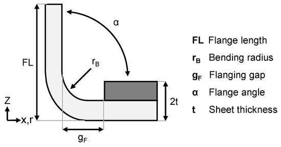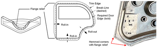 As table-top hemming is derived from a pure bending process, the observed stresses and strains are localized in the bending radius [11,12]. This includes tensile stresses in the outer fiber of the bending radius and compressive stresses in the inner fiber. In roller hemming, the stress state has an additional tangential component in the rolling direction. The flange is locally elongated in the rolling direction and causes tangential compressive stresses. This also leads to a tendency to wrinkling or surface waves in pre- and final hemming [13]. Therefore, table-top hemming and roller hemming of sharp contours and small radii still represents a challenge and often requires a so-called flange relief. This is a local reduction in flange length by tailoring the blank as indicated in Figure 4, which allows for the flange to lay flat after the final hemming step [3].