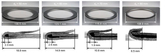 The recent concept of leveraging the benefits of ISF for a new joining method was initially investigated on hole flanges [19]. Similar to hemming, a subsequent joining operation by means of ISF is performed, after the incremental forming of hole flanges. Blanks with different initial diameters (d0) were widened using a 20 mm ISF tool to flanges with an inner diameter (d1) of 100 mm, resulting in different flange lengths between 11 and 22 mm. In the final step, these flanges were formed to partial as well as complete form-fit hems, as shown in Figure 5. All joints could be realized without failures like cracks and wrinkles. The resulting geometric deviations were attributed to springback. Overall, the study on joining of closed concave geometries by ISF proved a general feasibility of the process. However, no further investigations on the deformation mechanism or material flow during hemming were carried out [19].