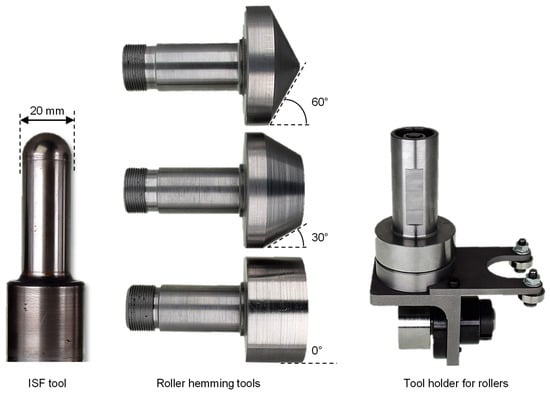 The experiments were carried out on an AMINO® DLNC-RB forming machine with exchangeable dies for each hem geometry. For flanging and ISF hemming, a rigid forming tool of 20 mm diameter was used. Because the forming machine only operates on 3 axes and is not able to angle the tools, special tools were designed to implement the roller hemming process. For three-stage hemming, exchangeable rollers with wall angles of 60°, 30°, and 0° were designed and fixed in a universal tool holder. The roller diameter was set to 45 mm at the contact point to the flange, as this showed the best results in previous works [10]. The tools used for all experiments are shown in Figure 9.