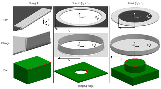 This work focuses on three hem geometries: straight, (closed) stretch, and (closed) shrink hems. The hem types as well as their corresponding flanges and dies are shown in Figure 10. Moreover, Figure 11 and Table 2 provide an overview of the dimensions of the specimen used. For the straight hems, a flange length of 20 mm and a flange width of 60 mm was selected. The stretch and shrink hems were set to an initial radius of 50 mm and flange length of 10 mm, as this has shown good results in previous works [20]. All parts were fabricated using cold forming oil Multidraw 472 as lubricant to reduce friction to a minimum.