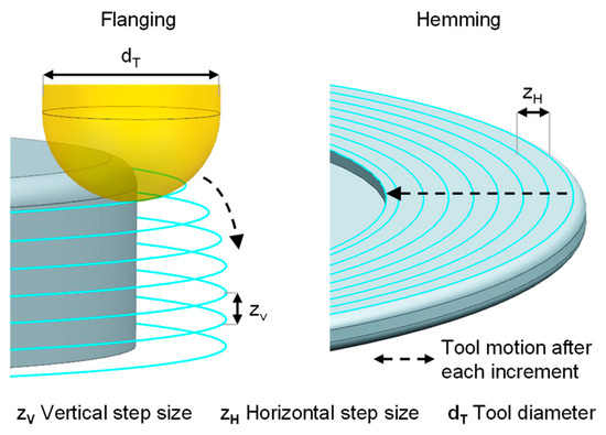 Incremental sheet metal forming (ISF) is an equally flexible process compared to roller hemming. It uses a universal, usually hemispherical tool to incrementally form a target geometry in many passes. It is characterized by high formability and flexibility due to the fast implementation from CAD design to finished components with low requirements for application-specific tools. In past works, ISF has been used for a variety of applications: automotive [14], medical sector [15], architecture [16], hole flanging [17], forming of composite materials [18], and many more. The increased formability is due to localized and successive forming. Since only a local area is formed while the surrounding areas are unclamped, the material can flow and distribute from thickness direction more easily. Here, higher strains are reached before failure, usually allowing for the process limits of conventional methods to be exceeded.