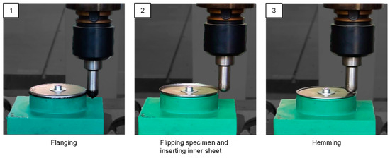 After flanging, the specimens were flipped, and an inner sheet was inserted. Then, hemming was resumed, as shown in Figure 14. The dimensions of the inner sheet were chosen so that a gap (gF) of 2 mm to the flange remained. ISF hemming was realized by successive horizontal lanes with a horizontal step size (zH) of 1 mm and no vertical offset (cf. Figure 13).