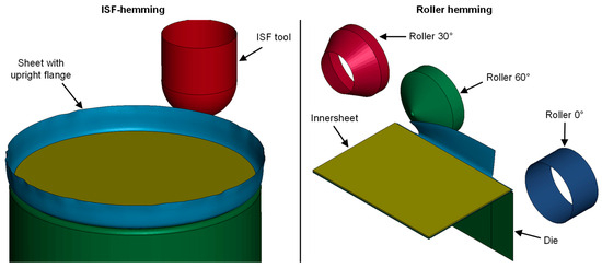 Exemplary setup for ISF hemming (left) and roller hemming model (right).
