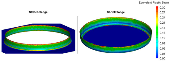 Equivalent plastic strain in stretch (left) and shrink (right) specimen after flanging simulation.