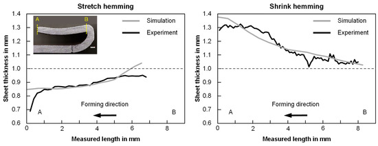 In order to validate the model, the simulation results were first compared with experimental measurements in terms of geometry, thickness distribution, and strains. Figure 20 shows the geometric comparison of the cross-sections for the stretch and shrink hem. The shell mid-plane was exported from the simulation results and aligned with the contour of the actual hems captured from a 3D scan via a best-fit method. The flat and undeformed regions were used as a reference for the best fit. This allows for better valuation of the hem contour and hem radius, though it neglects the roll-in/roll-out of the part. In general, the cross-sections show very good agreement, as the height and length of the hems match very well. The curvature of the hem, as was the case with the stretched hem, was also reproduced correctly. The most apparent deviations were observed in the hem radius. This may be due to simplified assumptions made during the simulation of the inner sheet, which was defined as rigid to reduce the calculation effort and time. Consequently, the lower section of the hems appeared to be flat. As shown in the cross-sections of the experimental hems, it cannot be entirely ruled out that the inner sheet was slightly deformed, allowing for the hemming radius to lift slightly.