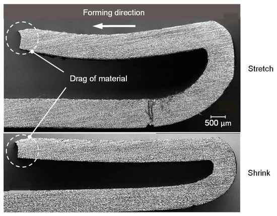 Previously, it was shown that stretch hemming results in a significant thinning and shrink hemming leads to increased thickness [20]. This behavior was also reproduced to a considerable extent by the simulation, where good agreement with the experiment was found in the middle section of the hems. Greater deviations were present at the hem edge and towards the hem radius. This may be due to the actual shape of the hem. As Figure 22 implies, there was a material drag in one-third of the sheet thickness from the point of tool contact. This may be due to shear in the tool contact surface, but it definitely changes the shape of the hem and influences the thickness measurements. At this point, the simulation model is unable to replicate this characteristic, where the shell elements only simulate the neutral fiber and cannot display surface effects such as this material drag.