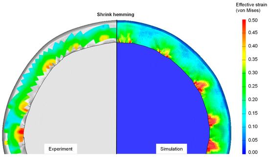Comparison of effective strains from experiment and simulation for shrink hem.