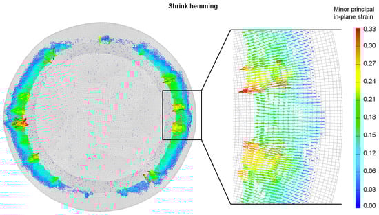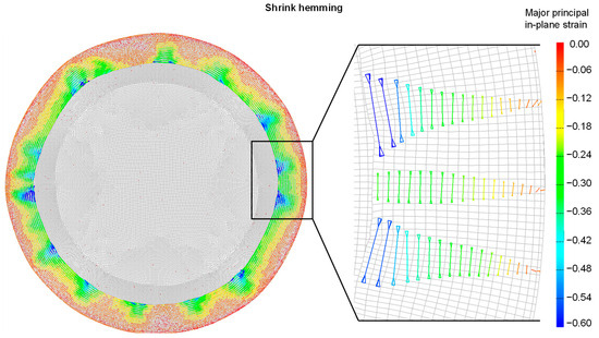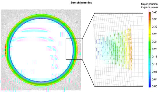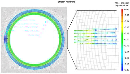 The deformation vectors show that the tensile strains are predominant in tangential direction and compression in radial direction. This result is not clearly consistent with the observations from the previous work, as the compression here indicates a reduced flange length after hemming, whereas a slight elongation of the hem was measured previously [20]. The explanation for this can be found in the measurement method in the experiment, where the flange length was measured along the outer edge of the hem. The simulation, on the other hand, only considers the neutral fiber for the mid-plane of the shell element. This results in a difference in the measured length. Further, as already mentioned, there is a surface effect of the dragged material, which was taken into account in the length measurement of the experiment but not in the simulation.