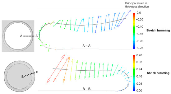 Vectors of strains in thickness direction for stretch and shrink hemming (bulge).