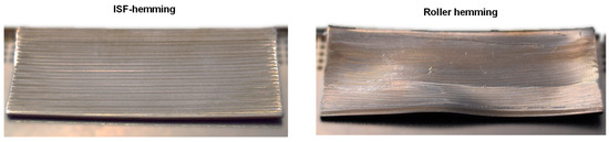 In order to compare the novel ISF-hemming with conventional roller hemming, experiments were conducted on straight hemming edges with a flange length of 35 mm. This geometry allows for better comparability, as there are fewer geometric constraints than in curved hems. Thereby, process management is also simplified, because the tools only have to follow straight lines in order to bend the flanges. Figure 31 shows the produced specimens for ISF hemming and roller hemming. In the case of ISF hemming, the surface showed characteristic grooves from the forming process, whereas the roller tool left a single distinct imprint on the hem, as it did not cover the hole flange while forming. Moreover, a slight wave shape could be seen in the roller hemmed specimen, while the ISF-hemmed specimen appeared to be rather flat with a light lift on the lateral edges. Despite the rather long flange length of 35 mm, the ISF-hemmed specimen shows better flatness.