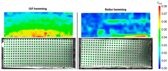 Optical strain measurement for straight hems formed with ISF hemming (left) and roller hemming (right).