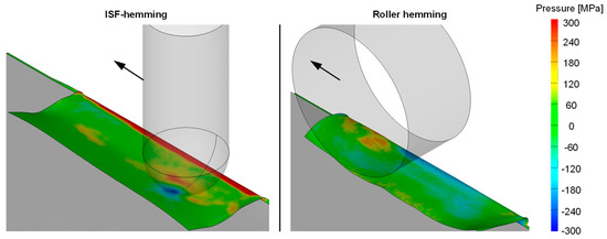 Again, numerical simulations were also set up for ISF hemming and roller hemming of straight hems. In order to gain insights into the deformation mechanism, the analysis focuses on the comparison of the deformation zones in both processes. As shown in Figure 33, the deformation zone is made visible by fringe plots of the so-called pressure in LS-PrePost. In ISF hemming, the deformation zone is divided in half in the forming direction. The half towards the hemming radius, i.e., the part of the hem, which has already been formed, experiences tensile load. The half towards the hem edge, the undeformed region, faces compressive load. This could explain the observations of the change in thickness of the hem, as the material is pushed and pulled away from the hemming radius. This also provides an explanation for the already-discussed drag of material in the outer fiber of the hem.