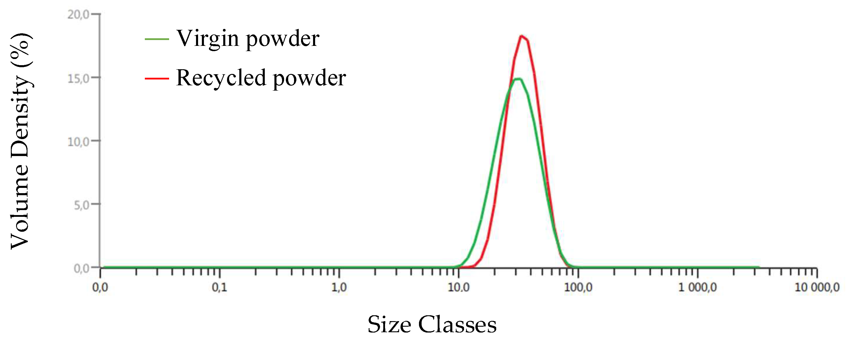 - The particle size distribution (PSD) showed that the size of the particles for the virgin powders varied from 10 to 90 µm, and it ranged from 15 to 90 µm in the case of the recycled powder. This was considered to be the most suitable distribution for the given application.