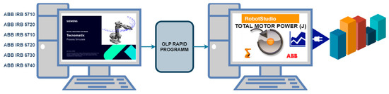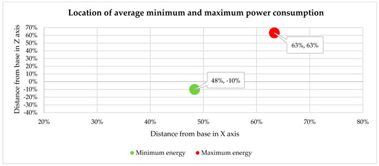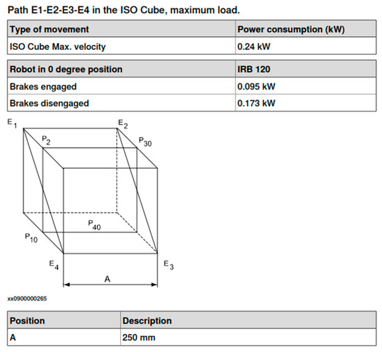 For this study, an ABB IRB 1600 robot was used, operating at a specified movement speed of 500 mm/s with a tool weight of 2.5 kg. During horizontal motion, the robot exhibited a power consumption of 11.4 Wh, whereas during vertical motion, it exhibited a slightly lower power consumption of 10.4 Wh. The trajectory was carefully designed to engage all six axes of the robotic arm throughout the movement to ensure a comprehensive assessment of the robot’s energy requirements across different orientations.