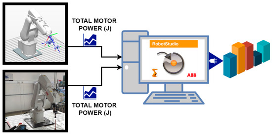 In the first phase of the research, the focus is on verifying the accuracy of the simulated values by comparing them with the actual measured values of the ABB IRB 120 industrial robot [71]. This step is crucial to confirm or refute the reliability of the chosen method for determining the optimal robot position in terms of energy consumption. For this purpose, the energy consumption of the real robot was measured and compared with the simulation results in the ABB RobotStudio 2024.1.1 environment. Validation of the confidence of the values allowed us to assess whether the simulations and the actual measurements show consistent results, ensuring that the values from the simulation accurately reflect the real energy consumption.