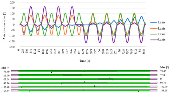 A typical industrial robot has a configuration with a 6-axis as the articulated robot [57]. Each joint is rotated by an electric motor about its axis. At each time instant, an angular position is associated with each joint, and the set of positions of all joints provides a complete picture of the robot’s position at that instant, which is referred to hereafter as the robot’s position. A straight-sided robot repeatedly performs several operations, each following a trajectory of motion. The trajectory describes the synchronous movement of all robot joints through time [58].