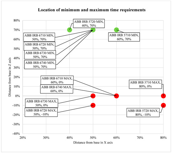 According to available literature and research, energy optimization can be improved by appropriate software or hardware settings or by optimizing the workplace layout. Energy optimization can be addressed in various ways, including mechanical and dynamic optimization or by modifying the mechanical parts of the robot [34,35,36,37]. Research is limited to available industrial robots without the possibility of modifying their structure and mechanics.