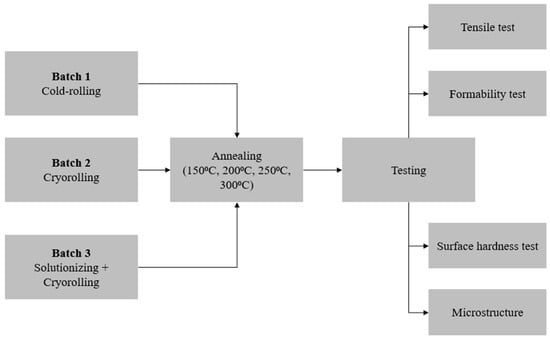 In the case of Batch 3, the samples were first solutionized at a temperature of 510 °C for 1 h to relieve internal stress. Following that, the material was quenched in water to increase the hardness. Following that, cryogenic treatment was performed by immersing the samples in liquid nitrogen for 30 min, followed by CYR to achieve the desired thickness of 1.5 mm. The schematic diagram of Soln + CYR is depicted in Figure 1.
