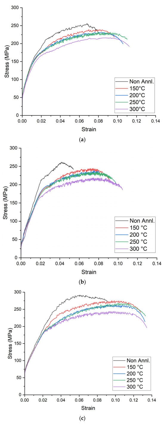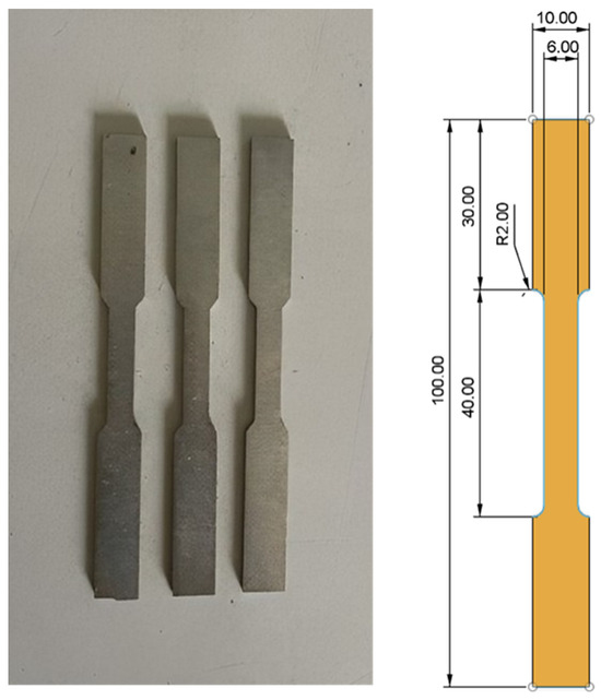 Tensile tests were performed on specimens from all three batches. For consistent and reliable measurements, the samples were prepared following the ASTM E8/E8M standard [25] (shown in Figure 3). Tensile testing was used to compare the upper yield stress and plastic behavior of materials that had been annealed at various temperatures. The results of these tests will be discussed in the following section, which will provide valuable insights into the mechanical properties. Uniaxial tensile tests were conducted at an initial strain rate of 1 min−1 using a Tinius Olsen machine, operating with a constant crosshead speed.
