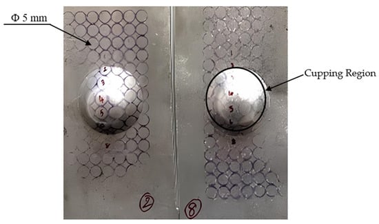 The height of the indented cup was measured using the LDH method. This method involves utilizing a set of dials integrated with the Erichsen cup testing apparatus. Furthermore, stamped circles within the cupped region were carefully observed using a profile projector, which was used to accurately measure their diameters. The major and minor strains of the circles were then measured. These strain values were then plotted on a graph to reveal information about the material’s formability and ability to withstand deformation without failure during the Erichsen cupping test. Along with precise measurements and graphical analysis, the LDH method contributes to a comprehensive evaluation of the material’s behavior under various annealing conditions. Figure 4 shows the Erichsen cupping test samples.