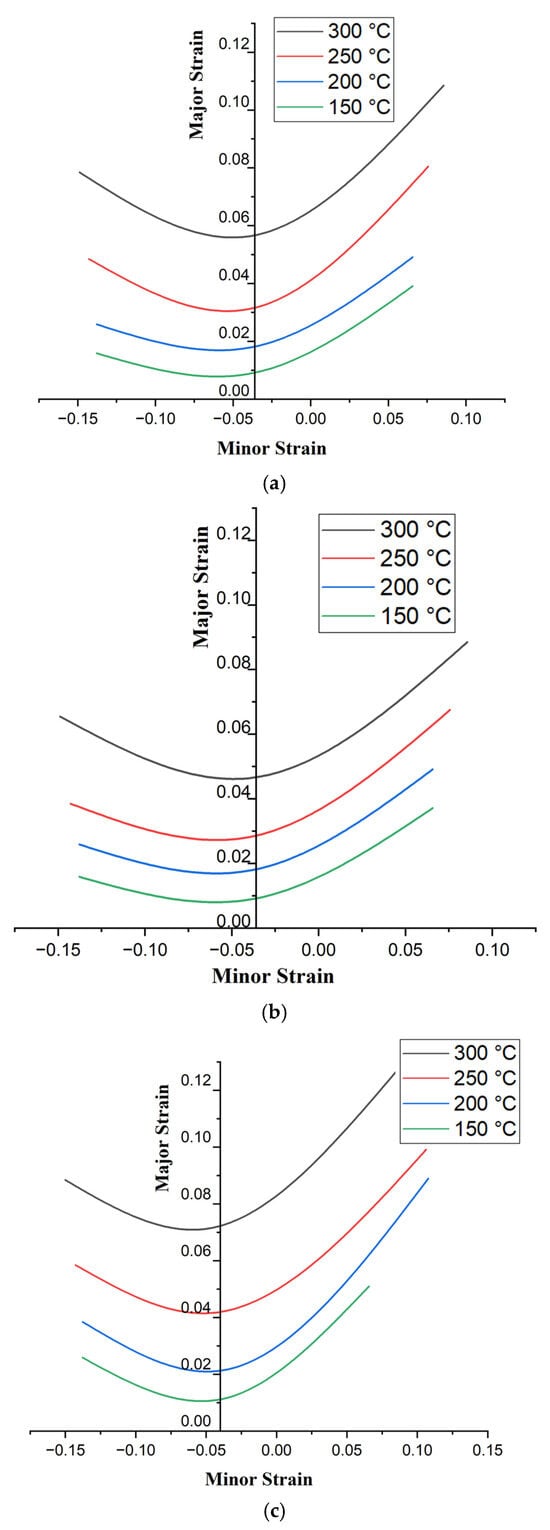 Similarly, at 200 °C, 250 °C, and 300 °C the Soln + CYR specimens demonstrated higher LDH values compared to the other groups. Figure 7a–c represent the FLCs for CR, CYR, and Soln + CYR specimens, respectively. These FLCs provide essential insights into the formability of the rolled sheets under various annealing conditions.