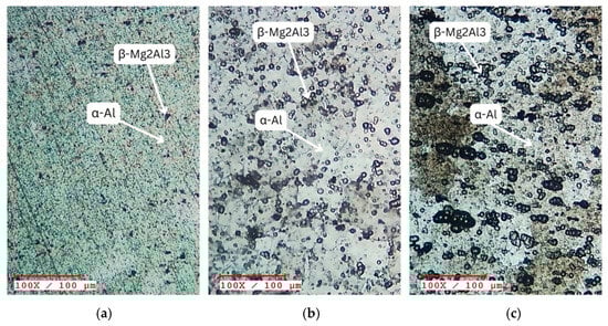 The microstructures seen in CR, CYR, and Soln + CYR specimens following annealing at 150 °C are shown in Figure 9a, Figure 9b, and Figure 9c, respectively. The microstructure of the base material reveals that the primary phase in the AA5052 alloy is α-Al, accompanied by the secondary intermetallic phase β-Mg2Al3 [1]. Notably, the microstructure of CYR and Soln + CYR specimens (Figure 9b,c) exhibit a noticeable variation in the β-Mg2Al3 intermetallic phase compared to the CR condition. While Figure 9a shows a lower density of β-Mg2Al3 precipitates, Figure 9b,c highlight that the size and distribution of these precipitates differ significantly across the conditions. The β-Mg2Al3 intermetallic phase influences the mechanical properties of the AA5052 alloy primarily through its role in impeding dislocation motion. The observed microscale precipitates contribute to strengthening via particle hardening mechanisms, with their distribution and size playing a key role in enhancing yield strength and hardness.