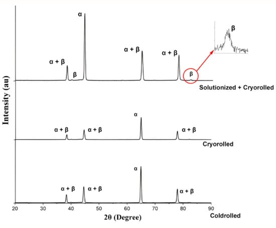 Solutionizing at 510 °C for one hour effectively relieves internal stress and promotes a uniform microstructure in the material. The reduction in induced stresses during annealing and grain structure refinement after CYR contributed to enhanced mechanical properties. The refined grain structure improves yield strength through grain boundary strengthening (Hall–Petch effect), while the alleviation of residual stresses during solution treatment allows for improved elongation by enabling uniform plastic deformation. Solution treatment prior to CYR dissolves solute particles and homogenizes the microstructure, reducing microstructural inconsistencies and promoting more uniform deformation during the subsequent CYR process. This process, conducted by submerging samples in liquid nitrogen, further refines the grain structure, producing ultra-fine grains and enhancing strain hardening. In contrast, CR or CYR samples starting from the as-received state retain pre-existing microstructural inhomogeneities, which limit their yield strength despite the higher accumulated strain. Consequently, the combination of solution treatment and CYR results in superior mechanical properties, as evidenced by the higher yield and ultimate strengths of the Soln + CYR samples compared to CR or CYR samples alone [26].
