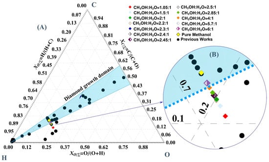 (A) C-H-O Ternary diagram, showing the diamond growth region. (B) Inset identifying the process conditions used for this work.