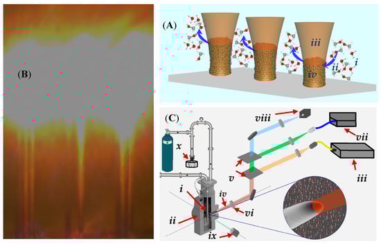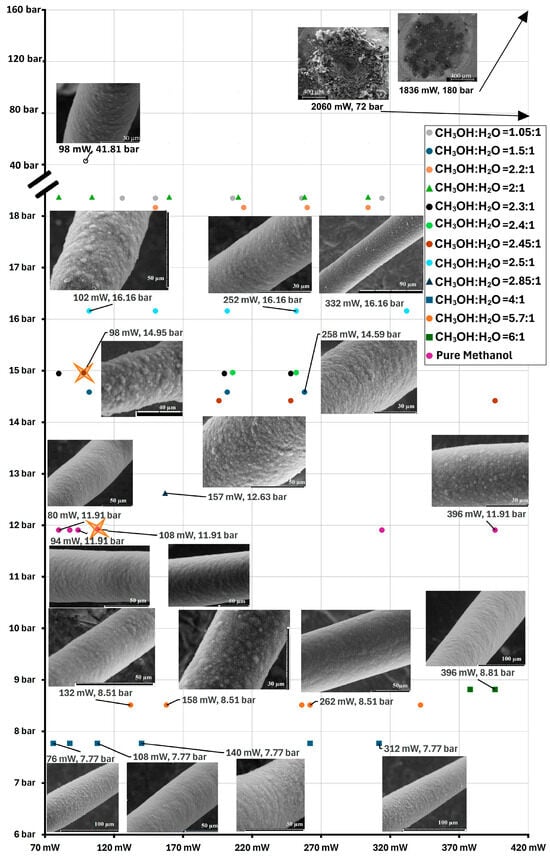 This work investigates the growth of carbon fibres from pure methanol, as well as the influence of water (and -OH groups) on the formation of various carbon allotropes from methanol–water mixtures. Only a handful of CVD experiments to grow diamond or other C-allotropes have been previously conducted using alcohols [,,,,,]. And to our knowledge, no prior HP-LCVD experiments with alcohols have been reported other than with ethanol–water mixtures by the authors []. Finally, no reported experiments discuss the growth of fibres by HP-LCVD through a precursor’s critical point, excepting prior patents by the same authors [].