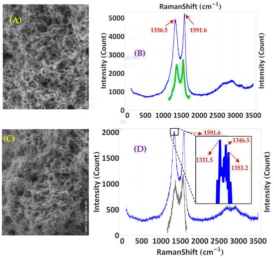 (A) Porous hydrogenated diamond-like carbon coatings with sp3 content ~ 40%, grown on the surface of carbon fibres; (B) Raman spectrum of the surface in (A) (blue curve), with a DLC:H reference spectrum (green) from the work of Hassan et al. []. (C) Porous unhydrogenated nanocrystalline diamond coatings, visually similar to (A), but showing a distinct diamond peak in the Raman spectrum (D) at 1332 cm-1 (see inset).