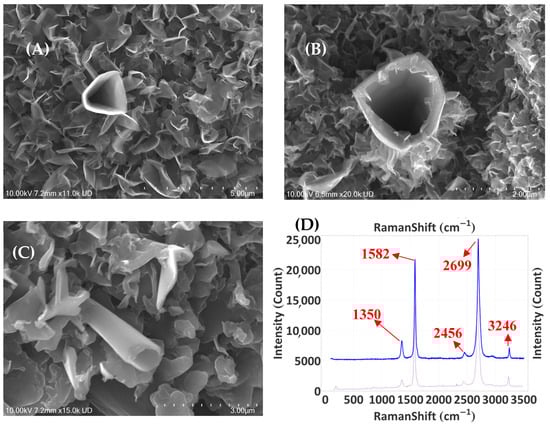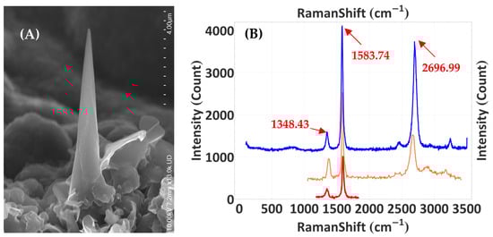 Many of the fibres in Figure 3 are graphitic fibres, where the graphite is highly disordered near the surface and, in some cases, is nano-structured graphite. Two examples of fine-grained highly disordered graphitic fibres are displayed in Figure 4, together with their corresponding Raman spectra (in blue). The fibre of Figure 4A was grown from CH3OH:H2O:Ar mixtures with partial pressures of 4.8, 1.2, and 1.8 bar, respectively, at a total pressure of 7.8 bar and 88 mW incident laser power—one of the lowest powers attempted in this survey. The Raman spectrum for fibre (A) exhibits narrow D-, G-, and 2D-Raman peaks at 1347.9, 1584.9, and 2699.4 cm−1 (see Figure 4B). This spectrum is typical of disordered nano/microcrystalline graphite, with a strong 2D-peak near 2700 cm−1 and moderate D-peak near 1350 cm−1. A characteristic shoulder at 1620.44 cm−1 and minor peaks at 2456.72, 2940.7, and 3247.78 cm−1 are also present. For comparison, a reference spectrum from Thomsen and Reich is provided (green curve), showing a disordered-graphite microcrystalline sample spectrum [].