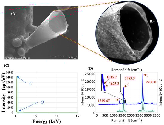 (A) Giant tubular graphite cone (g-TGC) grown on the surface of a carbon fibre in a methanol–water mixture of 2.84:1 and at an incident laser power of 593.43 mW. (B) The inset shows the giant internal nanotubular layer, with exterior graphitic carbon layers. (C) EDS spectrum of the nodule at the base of the cone shows only carbon and oxygen. (D) Raman spectrum of the g-TGC (blue curve) with reference spectrum (green curve) from Tan et al. [].