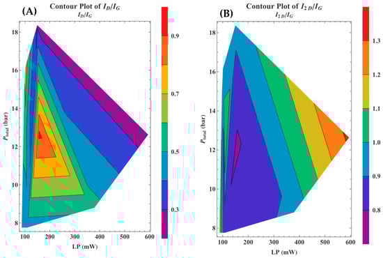 Contour maps of Raman spectral ratios: (A) ID/I/G ratios at conditions below 20 bar; (B) I2D/IG ratios under the same conditions.