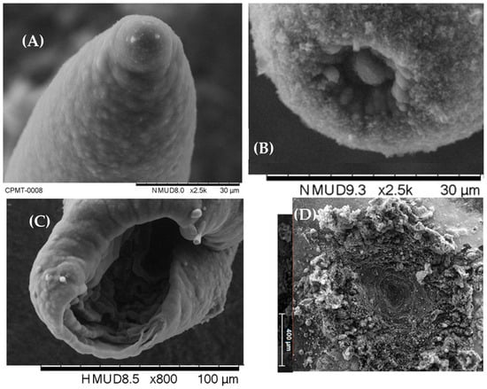 A similar class of conical carbon structures can be viewed in Figure 9A; in this case, the sample appears to be a graphene conical scroll (GCS), which forms a (hollow) conical needle with a sharp tip. One section of the scroll has delaminated and lies to the right side of the needle, while additional helical layer edges can be seen on the needle’s surface. This is akin to the needle-like TGCs synthesised by Zhang et al., where the graphene layer wraps around itself [].