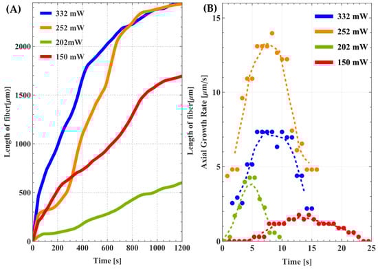 Growth rates for most of the fibres were recorded using a calibrated video microscope and star-tracking software version 6.1.6 []. For methanol–water mixtures of 2.5:1 and total pressure of 16.2 bar, axial growth rates of the fibres versus time are shown in Figure 12A, at four different laser powers. Note that each curve exhibits a nearly constant slope for much of the growth, which corresponds to the “steady-state” growth regime []; the bulk of the fibre material is deposited over this regime. Once the fibre leaves the Rayleigh range of the laser beam focus, and light begins to be reflected off its sides, rather than onto the growth zone, the fibre temperature drops, and growth slows. This can be seen in the “plateauing” of the curves at the right of the diagram. Of course, the greater the incident laser power, the longer the resulting fibres in Figure 12A, as the reaction zone is maintained above the growth threshold temperature for longer periods of time.