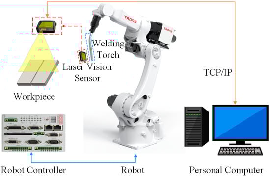 Robotic welding technology, which has the significant advantages of high productivity, stable welding quality, and repeatability, is promising in automotive, shipbuilding, bridge-building, and other fields [1,2,3,4]. Due to the difficulty of guaranteeing the accuracy and efficiency of the teaching–playback mode [5,6], welding seam identification and localization have been selected as the main scope of research projects by many scholars. Ultrasonic sensors [7,8], arc sensing [9], vision sensors [10,11,12], laser vision sensors [13,14,15,16], contact sensors [17], and other assorted sensors have gradually been used in this scope.