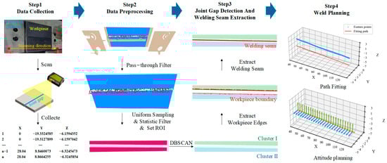 - Joint gap detection and welding seam extraction: The point cloud was divided into different clusters using the DBSCAN algorithm. Then, the welding path points were extracted based on the clustering results and the type of the welded joint.
