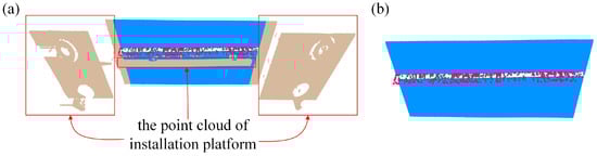 It can be observed that the noise was divided into dense point clouds of the installation platform and outliers in the middle of the joint gap. Because the distance between the installation platform and the sensor detection plane was larger than the distance between the workpiece plane and the sensor detection plane, the pass-through filter was used to remove the point clouds of the installation platform based on the height information of the point cloud. The filtering result is shown in Figure 3b.