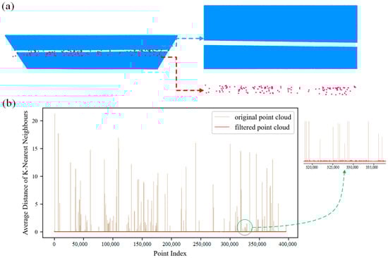 Statistical filtering. (a) Point cloud statistical filtering. (b) Average distance to KNN (K-nearest neighbor) before and after filtering.