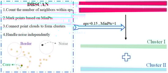 DBSCAN is a density-based clustering algorithm. It does not need to set the number of clusters in advance, and it can be applied to point clouds of any shape; therefore, it works well for both flat and curved workpiece surfaces. The implementation steps of the DBSCAN algorithm are as follows: