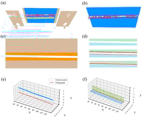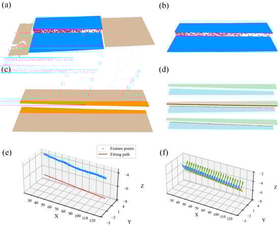 Butt joint with straight seam. (a) Raw point cloud. (b) Pass-through filtering. (c) Statistical filtering, uniform sampling filtering, and ROI operation. (d) Edge detection and feature extraction. (e) Welding path planning. (f) Welding attitude planning.