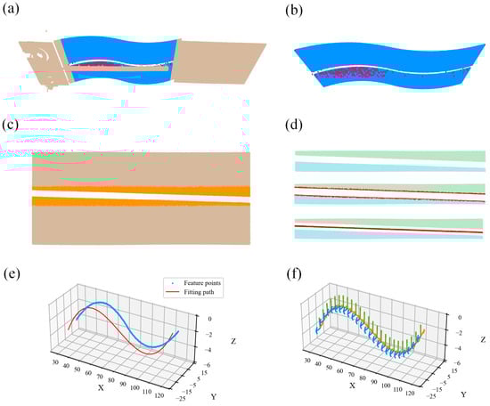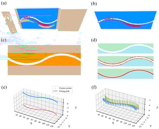 Butt joint with curved seam. (a) Raw point cloud. (b) Pass-through filtering. (c) Statistical filtering, uniform sampling filtering, and ROI operation. (d) Edge detection and feature extraction. (e) Welding path planning. (f) Welding attitude planning.